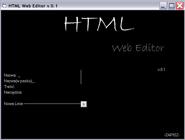 lukasspore Opublikowano 7 Marca 2008 Udostępnij Opublikowano 7 Marca 2008 Tytuł: HTML Web Editor Gatunek: Edytor HTML Opis: Program tworzy pliki HTML. Mała funkcjonalność (bo v.0.1.). Download: :excl: TU :excl: Rozmiar pliku: 11 KB Autorzy: Programowanie: lukasspore Fabuła: brak Grafika: lukasspore Muzyka: brak Screeny: :excl: TU :excl: Odnośnik do komentarza Udostępnij na innych stronach Więcej opcji udostępniania...