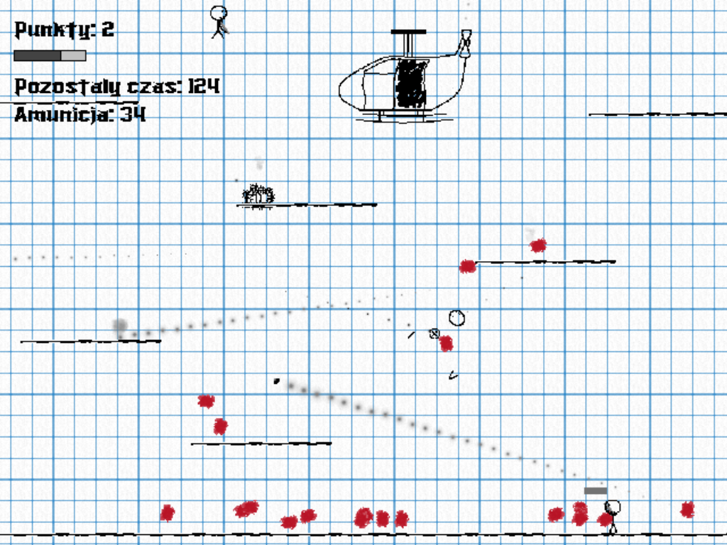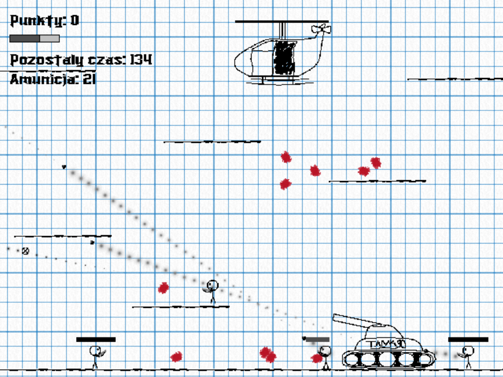 lenin Opublikowano 9 Sierpnia 2008 Udostępnij Opublikowano 9 Sierpnia 2008 Tytuł: War on Paper Gatunek: hmm strzelaninka ;O Opis: W grze sterujemy ludzikiem (a jakże) strzelając do wrogów,a akcja gry dzieje się na kartce papieru. W obecnej wersji, dostępne jest 10 poziomów, każdy po około 2 minuty, ostatnia plansza to walka z niby-bossem (nieukończonym bądź co bądź, ze względu na niewielką ilość pomysłów ;/). Mimo iż gra wydaje mi się trochę zbyt mało urozmaicona, to umieszczam ją już teraz, może podrzucicie parę pomysłów ;) Chyba, że gierka spotka się z ciężką krytyką, to projekt pójdzie do kosza ;/ Download: http://www.gmclan.org/up3106_4_War_on_Paper_v0_1.html Rozmiar pliku:spakowane ok. 1.1 mb Autorzy: Programowanie: Lenin Fabuła: Lenin Grafika: Lenin Muzyka: Narazie brak, problemy z loopowaniem ;/ Screeny: http://www.gmclan.org/up3106_6_wopnew.html http://www.gmclan.org/up3106_6_wop0_1.html Tak jak już napisałem wcześniej, przydały by się jakieś ciekawe pomysły nt. rozgrywki. Ta wersja zawiera parę bugów (wiem o dwóch - wróg zacina się na kantach platform, i w niektórych levelach zapada się w podłogę po prawej stronie roomu, ale to będzie poprawione) I jeszcze raz proszę o rzucanie jakimiś ciekawymi pomysłami, ewentualnie jak gierka się nie podoba to krytykujcie, tylko nie za mocno, bo gierka jest w bardzo wstępnej fazie tworzenia ;F Odnośnik do komentarza Udostępnij na innych stronach Więcej opcji udostępniania...