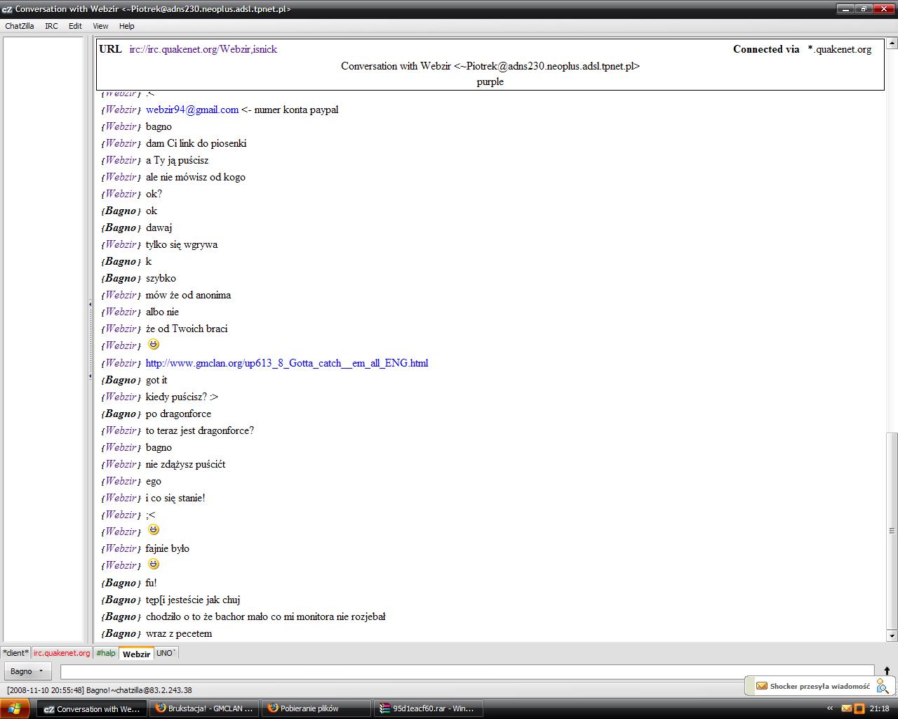 Grabarz Opublikowano 10 Listopada 2008 Udostępnij Opublikowano 10 Listopada 2008 Czekajcie, brat mi przeszkodził, poczekajmy aż sobie pójdzie :< Wez powiedz temu komuś z bruka zeby mnie odblokowal na skype. Mam dla niego 1400 spamerskich wiadomosci. <hehe> Odnośnik do komentarza Udostępnij na innych stronach Więcej opcji udostępniania...