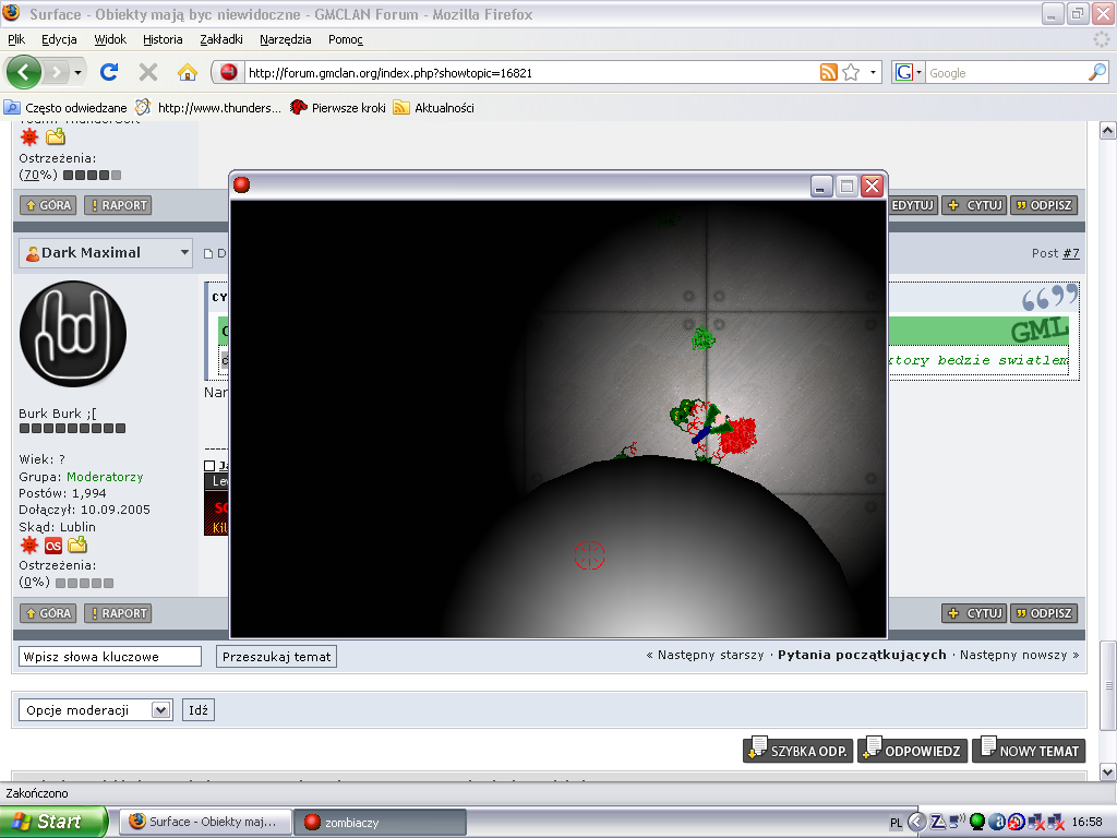 XxMichałxX Opublikowano 7 Marca 2009 Autor Udostępnij Opublikowano 7 Marca 2009 ja poprostu wsadziłem ten kod do obiektu surfaces ktory jest odpowiedzialny za światło wokol playera.. czyli zrobic inny obiekt i on ma miec odzielny 'surf' czy ma miec ten sam surf co od playera tylko ze wtedy zrobic global.surf? edit: zrobilem tak i znowu myszka lata a granat nie swieci ale go widac w ciemnosciach xd Odnośnik do komentarza Udostępnij na innych stronach Więcej opcji udostępniania...