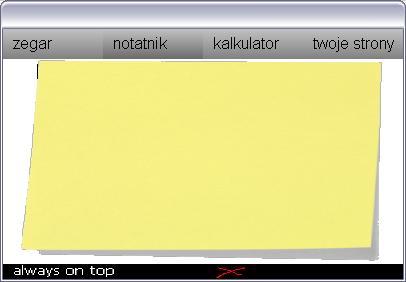 TheMarcQ Opublikowano 24 Sierpnia 2010 Udostępnij Opublikowano 24 Sierpnia 2010 Tytuł: organizer(wersja rozwojowa) Gatunek: program Opis: organizer zawiera : stoper zegar datę timer notatnik kalkulator auto otwieranie stron www opcje "always on top" jest to wersja 1.0 w 2 planuję: 1. mini chat 2. poprawienie wyglądu 3. dodanie paru opcji do kalkulatora 4.poprawienie notatnika, który ma na razie wiele wad 5. dodanie opcji programu(np. rozmiaru okna, które podzespoły mają być włączone, a które nie) Download: https://gmclan.org/up6357_4_organizer.html Rozmiar pliku: 1.58MB Autorzy: Programowanie: JA Grafika: ja+windows Muzyka: game maker Screeny: https://gmclan.org/up6357_5_52de26c8ae.html https://gmclan.org/up6357_5_bez_tytu_u2.html Odnośnik do komentarza Udostępnij na innych stronach Więcej opcji udostępniania...