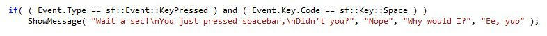 Funkcja zwraca inta jak ta gmowa, ale nie miałem po co go wykorzystywać, więc wywołałem samą funkcję bez wydziwień. Jak się pokazuje okienko to się gra ładnie stopuje. Tylko jeszcze nad wyglądem będę musiał popracować.