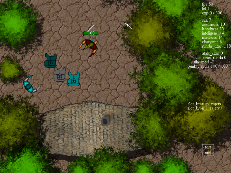 Kolejny screen z testów silnika, zrobiłem już prawie system walki, modyfikatory (częściowo), rundy, trak0, kp, trafienia krytyczne itd. Animacja szkieletowa skończona, ekwipunek praktycznie też. Teraz najważniejsze rzeczy do zrobienia to AI przeciwników i sprzymierzeńców, czary, handel, hud (w tym okno dialogowe). No a później cała reszta, wiadomo co.