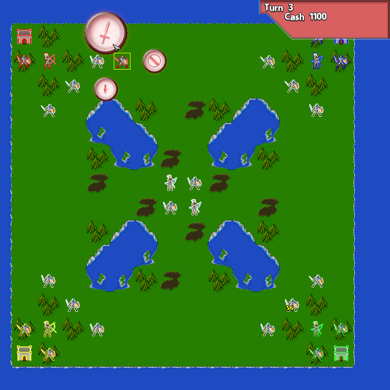 Po za tym wreszcie jest podział na tury i drużyny ( czerwona, niebieska, zielona, żółta i neutralna: biała ) oraz w zamkach można kupować jednostki, ale menu kupowania jest mocno improwizowane ( menu kontekstowe ) : D
