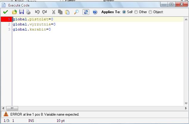 dyzmek Opublikowano 22 Marca 2011 Autor Udostępnij Opublikowano 22 Marca 2011 jak wpisuje w create danej broni kod i w miejsce noz daje swoje wspolrzedne np pistolet to mi podkresla na czerwono z eblad jest nawet nie wiem dlaczego :-( Ewentualnie możesz użyć zmiennych globalnych. Mają to do siebie, że dostępne są zawsze i wszędzie, w każdym roomie, dla każdego obiektu. Nie tworzy się ich w żaden specjalny sposób - po prostu każda zmienna globalna zaczyna się od "global." z kropką. GMLglobal.noz = 1 global.pistol = 0 global.shotgun = 0 Odnośnik do komentarza Udostępnij na innych stronach Więcej opcji udostępniania...