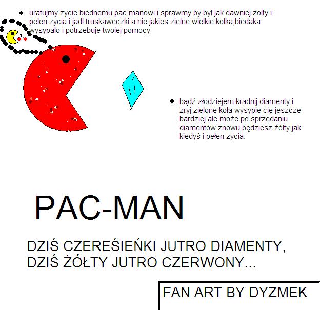 dyzmek Opublikowano 20 Czerwca 2011 Udostępnij Opublikowano 20 Czerwca 2011 więc tak zacznę od tego fabuła gry-był sobie jeden pac-manek lecz zachorował i ma czerwonkę bo zawsze był żółty ale nie w tej części będzie musiał zbierać wielkie i małe diamenciki sprzedać je i kupić sobie polupirynkę by iść się leczyć ale złe potworki chcą mu ukraść i go zjeść hmm (ale złodzieje prawda ? ) ale nasz bohater nie daje się i odważnie pokonuje poszczególne lvle i kradnie diamenty by kupić sobie lek w aptece okazuje się że apteka zamknięta i bohater i tak umiera :-) a co do gry- niby fajan ale odbiegająca i odżucająca ludzie nie będę grał czerwonym pac-manem gra zasługuje na 2,5/5 za starania zaraz podeślę co nieco :-) czekajcie na edit-a :-) proszę coś ode mnie może wam się nie spodoba ale po raz kolejny w moim drógim fan aracie chcę pokazać swoje odczucia co do gry. https://gmclan.org/up6167_5_DYZMEK_FAN_ART_PAC_MAN.html Odnośnik do komentarza Udostępnij na innych stronach Więcej opcji udostępniania...