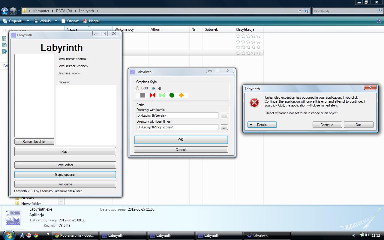 Utermiko Opublikowano 25 Czerwca 2012 Udostępnij Opublikowano 25 Czerwca 2012 Tytuł: Labirynth v 0.1 Gatunek: Logiczna? Opis: Gra polegająca na jak najszybszym przejściu labiryntu, w niektórych trzeba również zebrać gwiazdki. Razem z grą, jest dostępny edytor poziomów, dzięki któremu możesz samemu tworzyć labirynty. W folderze z grą znajduje się folder ?levels?, gdzie należy umieszczać poziomy w które chcemy grać. Można ścieżkę położenia folderu z poziomami oraz najlepszymi wynikami zmienić w opcjach gry. Język: Angielski. Download:>>>DOWNLOAD<<< UWAGA!!! Do działania wymagana jest biblioteka .NET Framework 4, którą można pobrać stąd: POBIERZ .NET Framework 4 Rozmiar pliku: 20 kB Autorzy: Programowanie: Utermiko Screeny: Odnośnik do komentarza Udostępnij na innych stronach Więcej opcji udostępniania...
