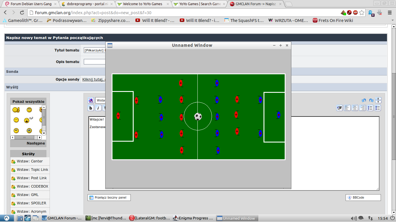 Fervi_ Opublikowano 5 Stycznia 2013 Udostępnij Opublikowano 5 Stycznia 2013 Witajcie! Zastanawia mnie jak zrobić fizykę piłki w grze "piłkarzyki" https://gmclan.org/up6184_6_2013_01_05_1554...x768_scrot.html Coś takiego mam (piłka na razie jest nie do gry :D), zastanawia mnie jak zrobić kopnięcie piłki (tzn, że jak np. nacisnę spację to piłka leci przed siebie) - kąt piłki (jak piłka zostanie uderzona w któryś róg, to w odpowiednią stronę leci) itd. Proszę o wasze propozycje (i być może kod, jak komuś się chce) Fervi Odnośnik do komentarza Udostępnij na innych stronach Więcej opcji udostępniania...