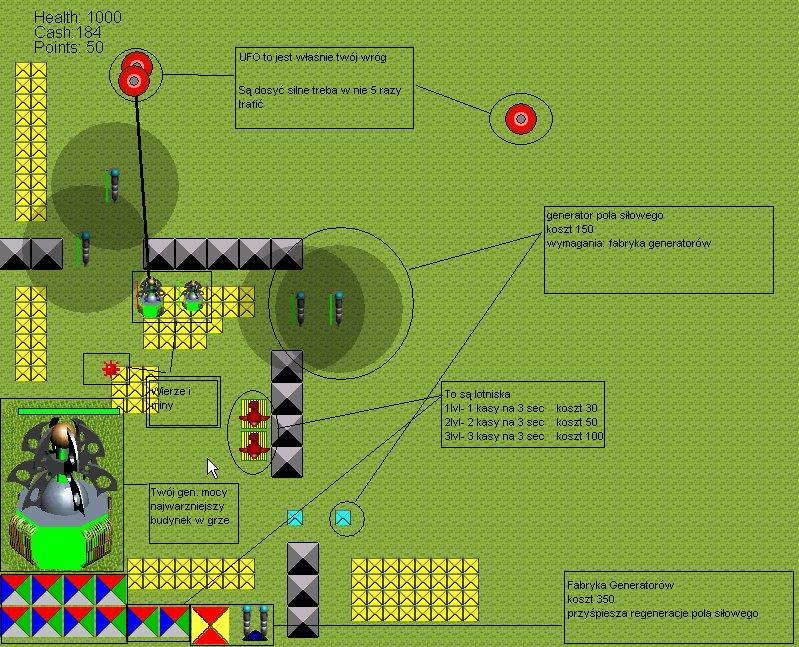 swiatcienia Opublikowano 1 Stycznia 2007 Udostępnij Opublikowano 1 Stycznia 2007 Witam proszę ocenić demo mojej gry to jest beta ale pozbawiona błędów. Gra jest w typie Tower Defence W grze są 2 rodzaje potworów: Ufo, Ufo boss bronie: wieża laserowa, wieża daleko dystansowa laserowa, mina, pole siłowe budynki: @1 lotnisko 1lvl-koszt 30 1 kasy na 3 sec 2lvl-koszt 50 2 kasy na 3 sec 3lvl-koszt 100 3 kasy na 3 sec @2 fabryka Koszt 350 możliwość budowania pola siłowego Link: https://gmclan.org/up1543_4_Tank_War_beta_v1_2.html ScreenShot https://gmclan.org/up1543_5_ScreenShot003.html Intro(filmik) planowane zmiany: 1. Map edytor 2. Więcej budynków i wież 3. Nowi wrogowie 4. Updaty budynków Odnośnik do komentarza Udostępnij na innych stronach Więcej opcji udostępniania...